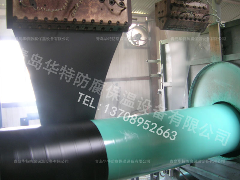 水冷却的方式是国内外绝大部分三层防腐管道厂家采用的冷却方式。由于三层结构的防腐管道外部涂层较厚,导热时间较长。生产中可以通过控制给水量和给水温度的方式,使管体达到缓慢冷却的目的,水冷只从外部对管体进行冷却,冷却时外涂层首先得到冷却,通过能量转换的方式,对内涂层起到冷却的目的,所以,水冷不是直接作用到内涂层,而是通过外涂层、管体间接缓慢的作用到内涂层。